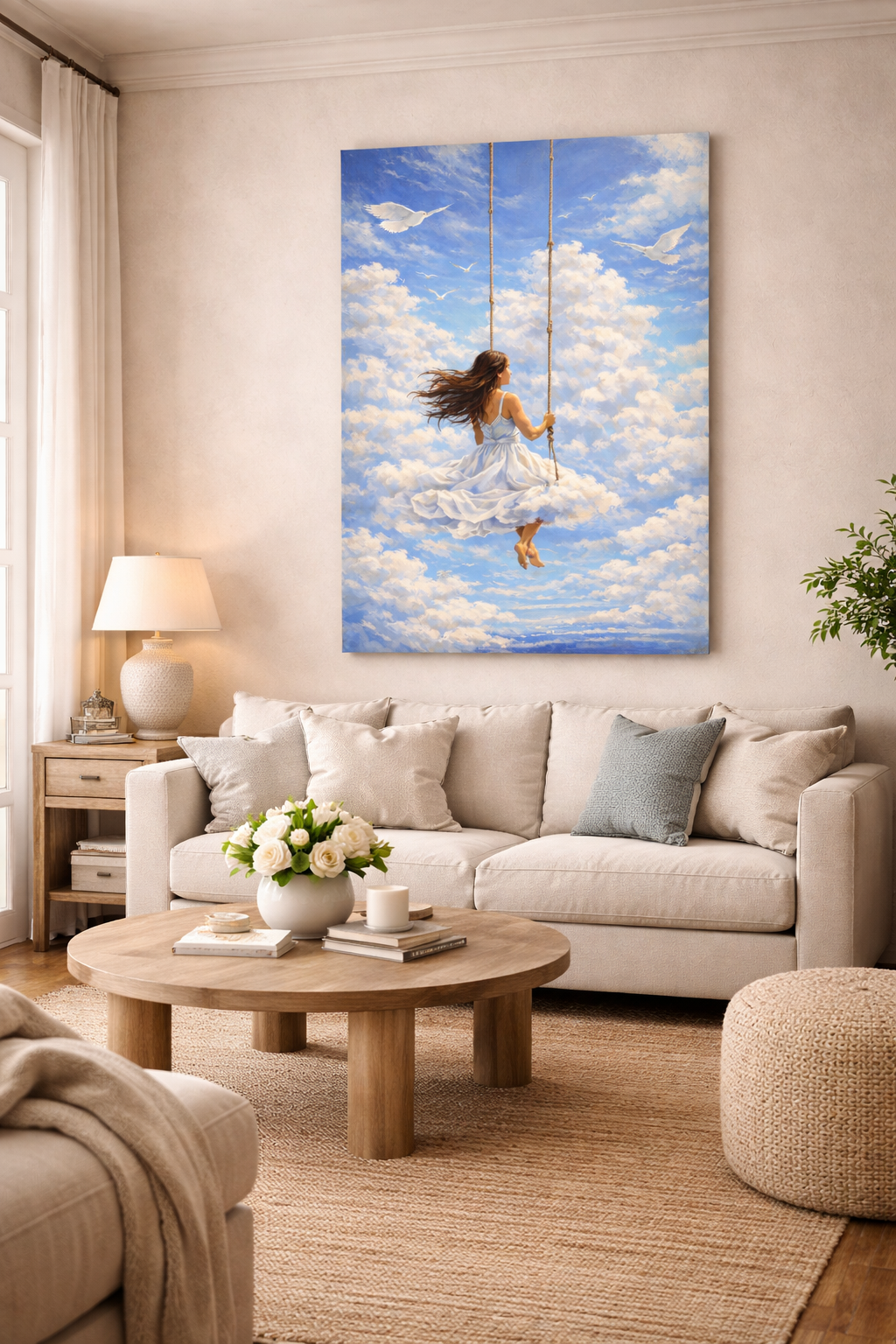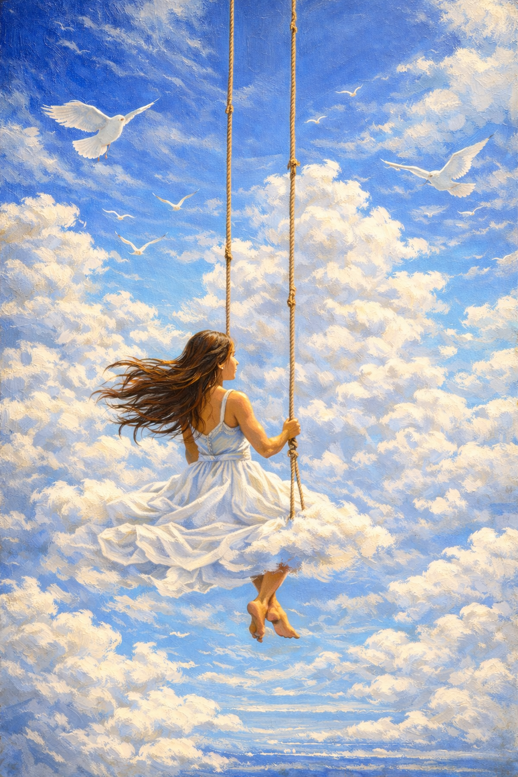 A dreamlike composition portraying a woman suspended on a swing above endless clouds, surrounded by soaring white birds and an expansive sky. Soft painterly textures and luminous depth create a contemporary women canvas art piece centered on freedom, possibility, and elevated perspective. Ideal for bedrooms, meditation corners, creative studios, and airy living spaces that embrace imagination, openness, and tranquil escape.