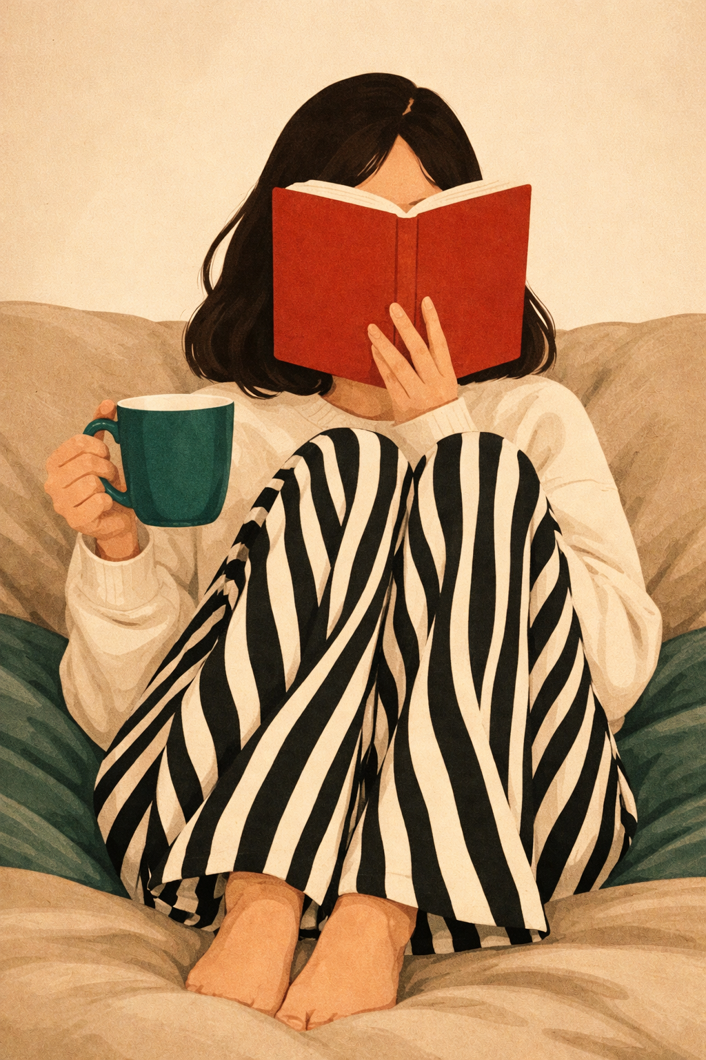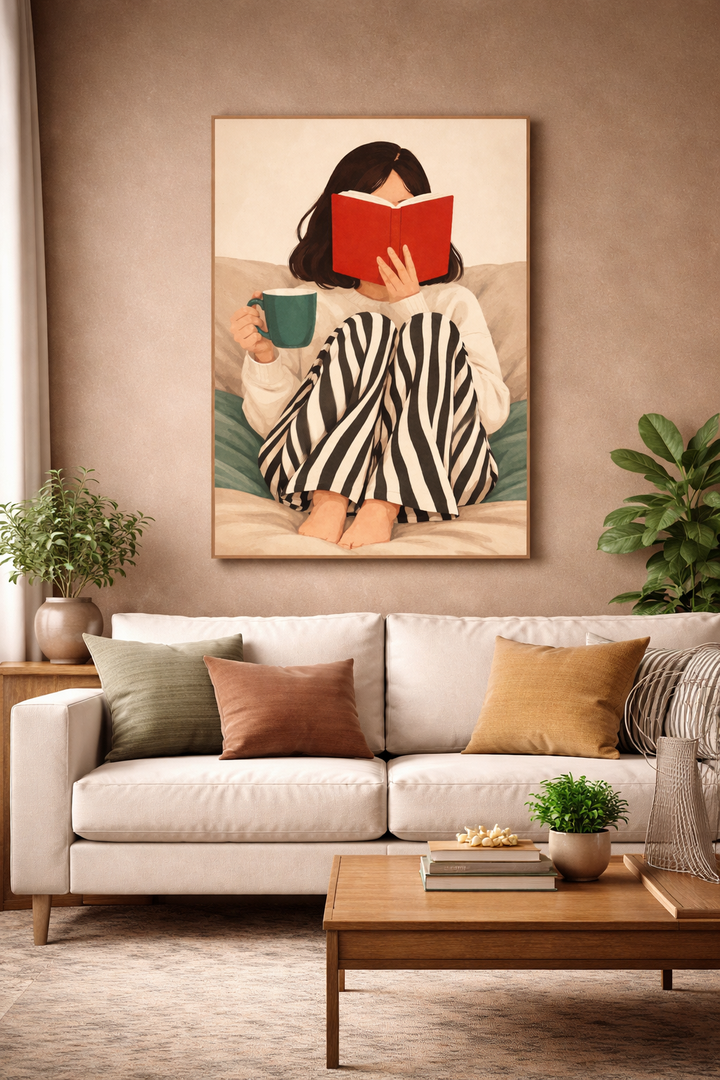 A contemporary female portrait capturing a woman absorbed in her own world, book raised, coffee in hand. The bold black and white stripes contrast with warm neutrals, creating a striking yet intimate women canvas art piece. Perfect for modern bedrooms, reading corners, and creative spaces that value independence and quiet confidence.