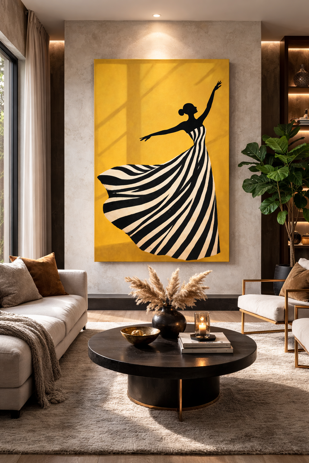 A bold female silhouette in a sweeping black and white striped dress set against a rich golden backdrop. The flowing lines create movement and drama, making this women wall art piece a powerful focal point in modern interiors. Ideal for living rooms, studios, and statement spaces that celebrate strength, grace, and contemporary female form.